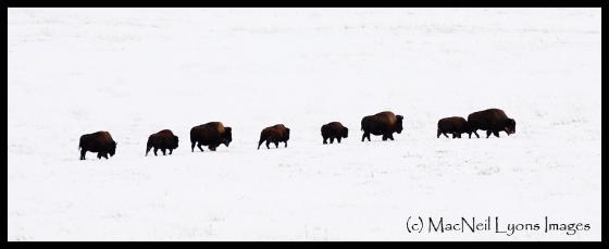 Bison Contrasts, Lamar Valley, Yellowstone N.P., WY January 13, 2012 My first installment of the 2012 Pic o' the Week! With less snowpack on the Northern Range, there is more forage for bison this year, than in times past... This images shows a group of cows and their calves making their way towards the Lamar River across the wind blown grasslands. I changed the levels slightly on this digital image and pulled up the contrast a bit to create the stark difference in black and white colors.